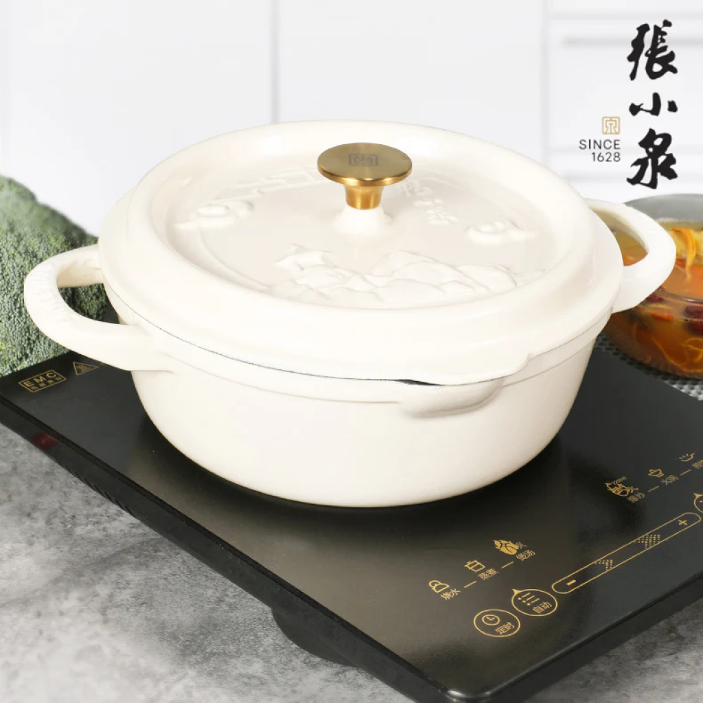 杏馥琺瑯煎盆: 蒸汽自循環加厚鑄鐵材質 微孔琺瑯內壁 燜煮煎 凝水點均勻分布:水汽均勻回落 激發食材原汁原味 便攜雙鍋耳:鍋身,鍋耳一體燒鑄而成 堅固穩定,端取更方便 金屬加高鍋鈕:3.5cm加高鍋鈕 易拿易放 加厚鍋底:鍋底加厚處理,放置平穩耐加熱、耐火燒 杏馥琺瑯燉鍋-24CM 容量3.8L 重量4.4KG 琺瑯鑄鐵鍋擁有聚熱保溫,微壓烹飪的優點,更能鎖住食物原汁原味 琺瑯釉材質,經久不粘,清洗更容易