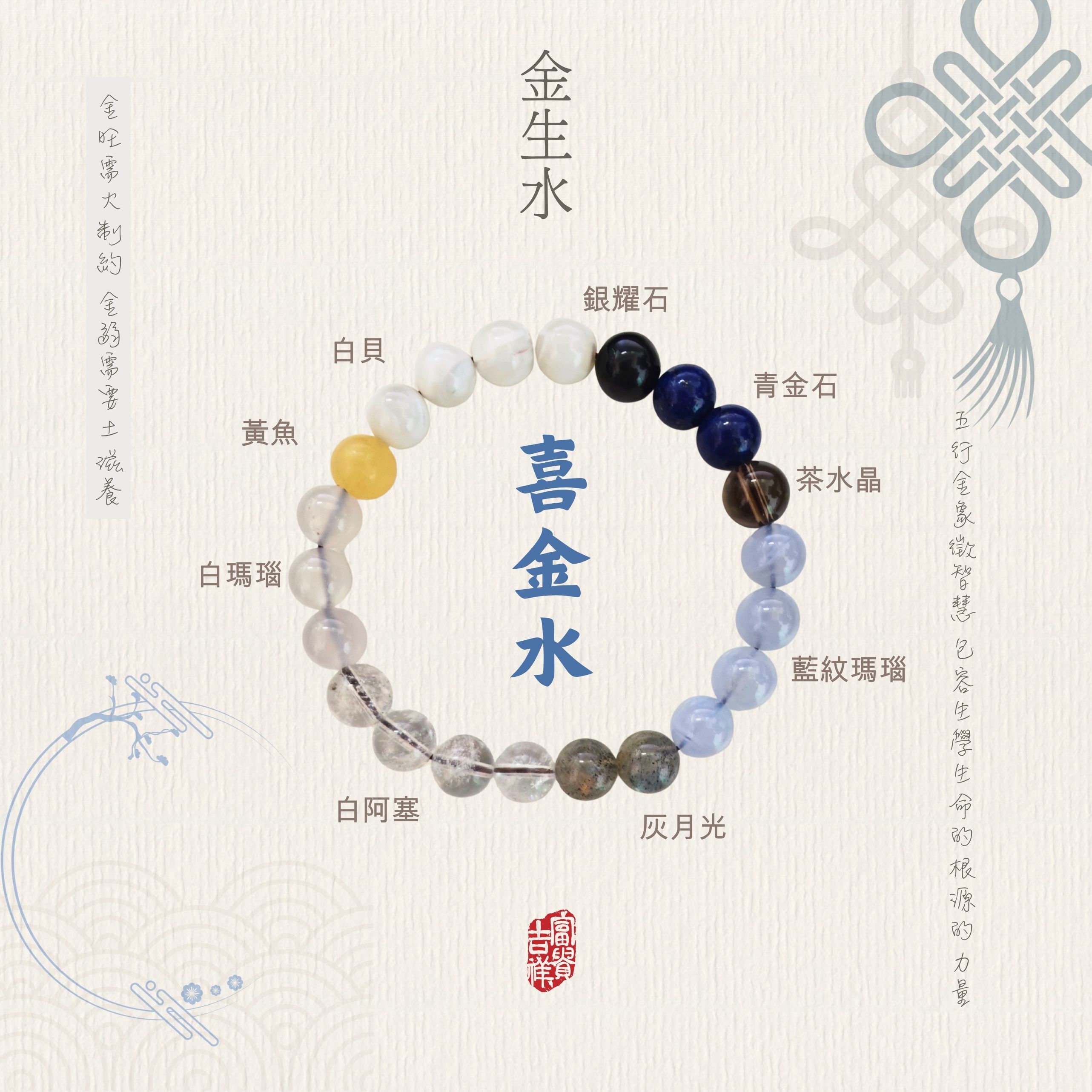 如果你的八字中五行分佈較為均衡,可以選擇多屬性混合手串,例如同時包含木、火、土元素的組合,以達到平衡效果。 土生金:金需要依附於土,土的存在使金得以形成和聚集。 金生水:金的特性使其能夠生水,金的溫潤之氣可以轉化為水的流動性。 金克木:金能克制木,象徵金的果斷和強勢。 精煉氣場、專注致勝、凝聚財氣 五行靈感: 補「金」元素 香氣描述: 前調: 冰冷的醛香與杜松子的清冽氣息劃破空氣,香檸檬的微光隨之展現,帶來清 冽肅淨的開場。 中調: 香氣核心轉為冷靜與知性,紫羅蘭的冷調粉質在通透的氛圍中浮現,散發出 獨特氣質。 後調: 由龍涎香的礦石光澤、乾燥苔蘚與雙重麝香構成的堅實基底上,旨在啟發內 心的專注與決斷力,喚起如金屬般精煉、珍貴的氣場。 精煉氣場、專注致勝、凝聚財氣 清冽肅淨的香氣,靈感源自純金的凝聚力。 冰冷的醛香與杜松子的鋭利氣息劃破空氣,香檸檬的微光隨之展現。 香氣沉激在由白琥珀的礦石光澤與麝香構成, 旨在啟發內心的專注與決繼力,喚起如金屬般精煉、珍貴的氣場。