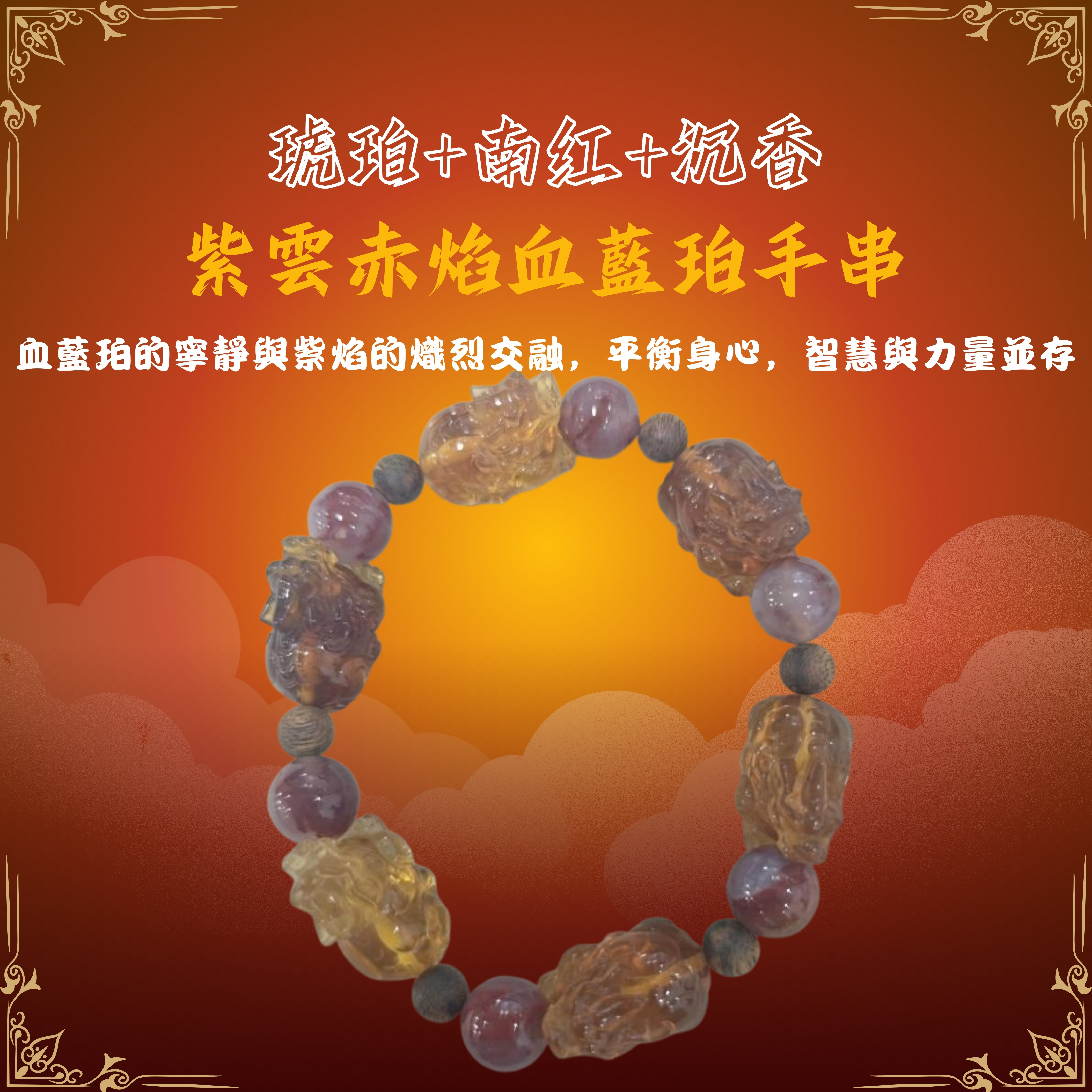 靈通天地,悟道啟明。血藍珀通靈,紫雲赤焰開悟,佩戴可增強直覺與感知力,助人連接高維智慧,明心見性。