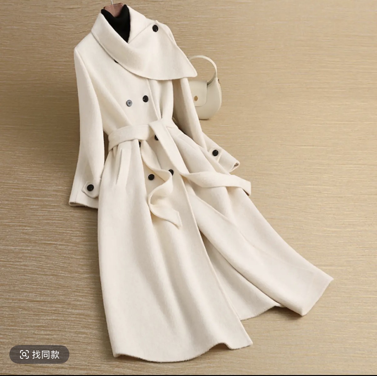 11130017 围巾领双面羊毛大衣女长款系带收腰款