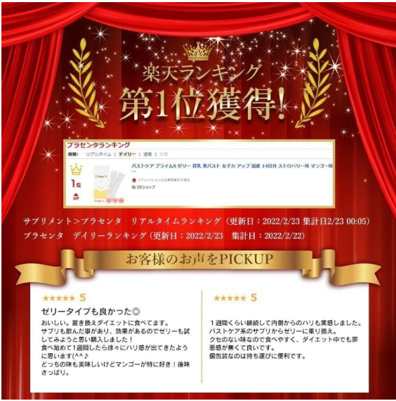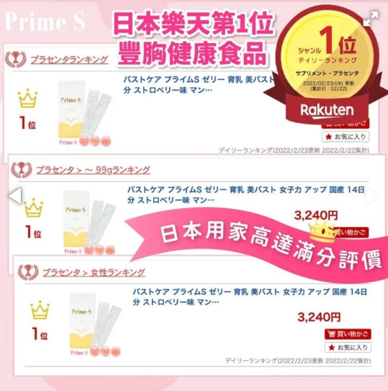 (日本樂天網第一位&Monde Selection Award銅獎) (日本樂天網第一位) Prime-S – V塑美肌胎盤素豐胸啫喱: 🔺日本專利「彈性蛋白」豐胸成份配合 🔺天然成份,不含激素,不含西藥成份 🔺真人實證最快1個月明顯提升胸部 🔺日本制,獲GMP、ISO認證 🔺日本藥物安全局認證 🔺使用者滿意度高達95% 🔺改善胸部彈性、下垂問題 🔺添加胎盤素成份:激活未充份發育的乳房細胞 🔺包裝設計貼心,告別食豐胸健康食品的尷尬 🔺味道迎合女性喜愛,啫喱1盒有兩款口味:士多啤梨、芒果,味道似食零食般好味