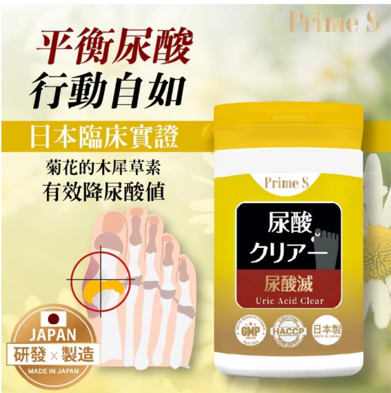 🔺日本臨床實證:菊花的木犀草素有效降尿酸值 🔺促效提升關節靈活度,改善腳趾關節紅腫不適 🔺含5大尊貴成分,菊花萃取物、魚肉萃取物、路易波士茶萃取物、甜茶萃取物、酸櫻桃萃取物,快速排尿酸,舒緩不適