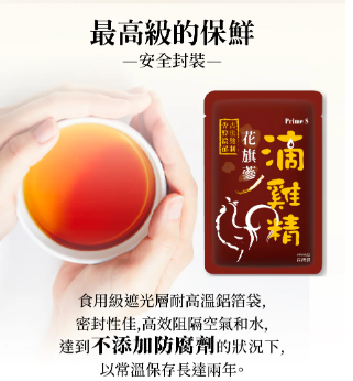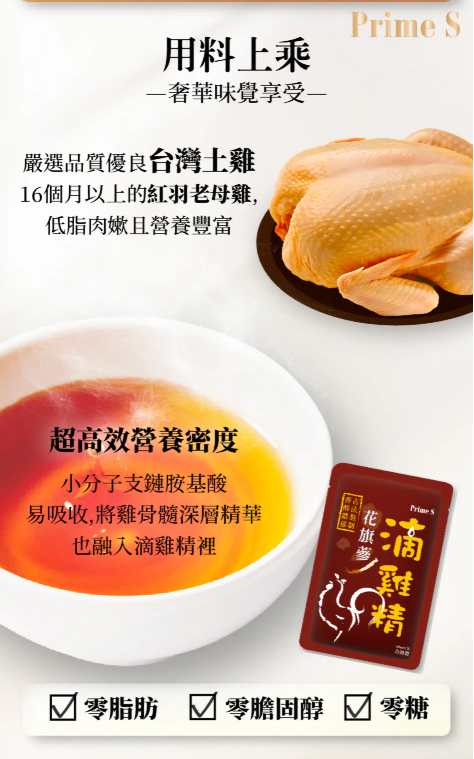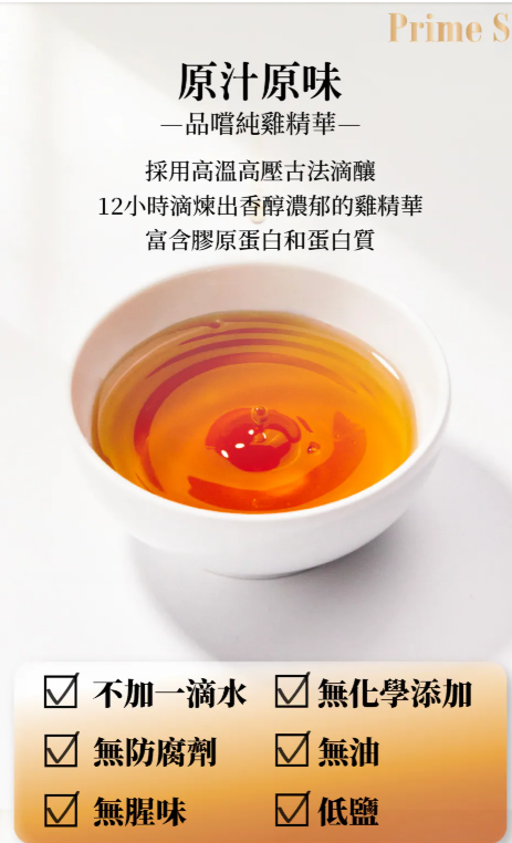 嚴選上等台灣土雞-紅羽老母雞,傳承古法熬制,採用12小時高溫高壓滴釀法,將深層精萃融入滴雞精裡,富含膠原蛋白和蛋白質。無添加一滴水,保留最原始最濃郁的滋味,並分離不必要的油脂,減少熱量的吸收。