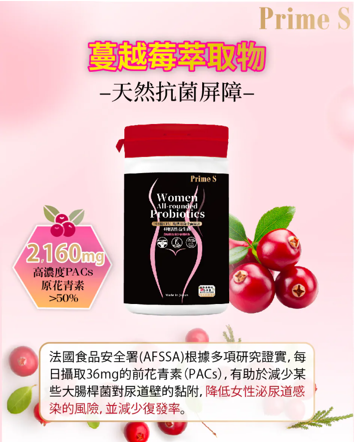 蔓越莓萃取物(2160mg): 法國食品安全署(AFSSA)根據多項研究證實,每日攝取36mg的前花青素(PACs),有助於減少某些大腸桿菌對尿道壁的黏附,降低女性泌尿道感染的風險,並減少復發率。