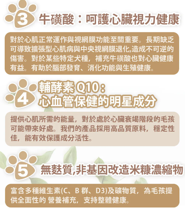 提供心肌所需的能量,對於處於心臟衰竭階段的毛孩可能帶來好處。我們的產品採用高品質原料,穩定性