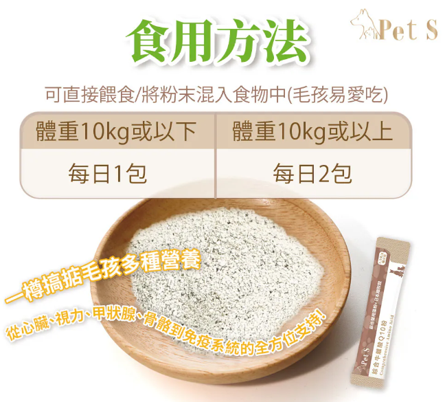 獨立包裝:獨立包裝的粉末劑型讓您餵食更輕鬆,不論是混入主食、肉泥, 還是直接餵食,毛孩都樂於接受。