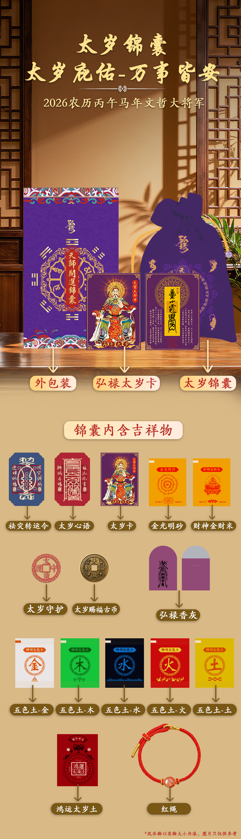 外包装x1 弘禄太岁卡x1 太岁锦囊x1 祛灾转运令x1 太岁心语x1 太岁卡x1 金光明沙x1 財神金財米x1 太岁守护x1 弘禄香灰x1 神州五色土 五色土-金x1 五色土-木x1 五色土-水x1 五色土-火 x1 五色土-土x1 鸿运太岁土x1 红绳x1 风水物以实物大小为准,图片只仅供参考